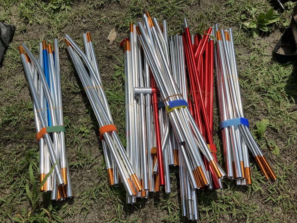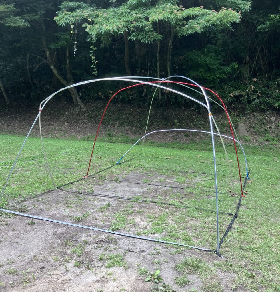 SSテープを基準にしながら、ポールA〜Eを順に仮組みし、フレームを立ち上げます。まずは平置きで配置を確認し、次にポールを立ててフレームを構築します。